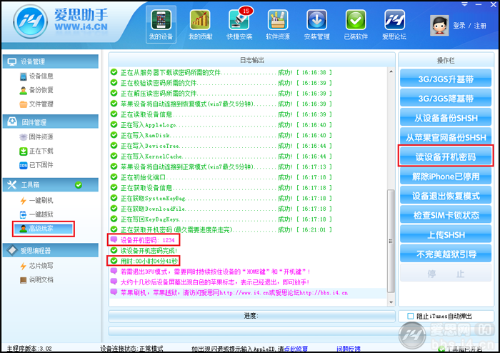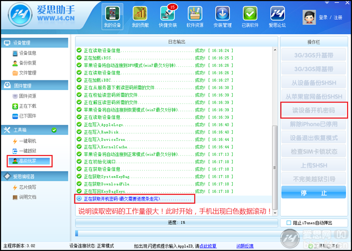 设备一旦进入到DFU模式,爱思助手立即开始“获取开机密码”!显示如下: