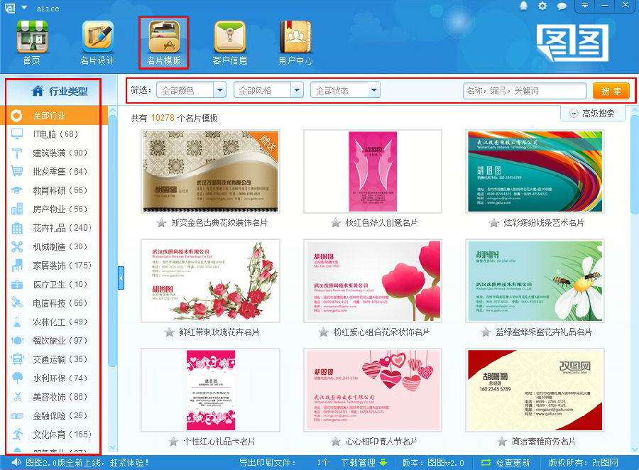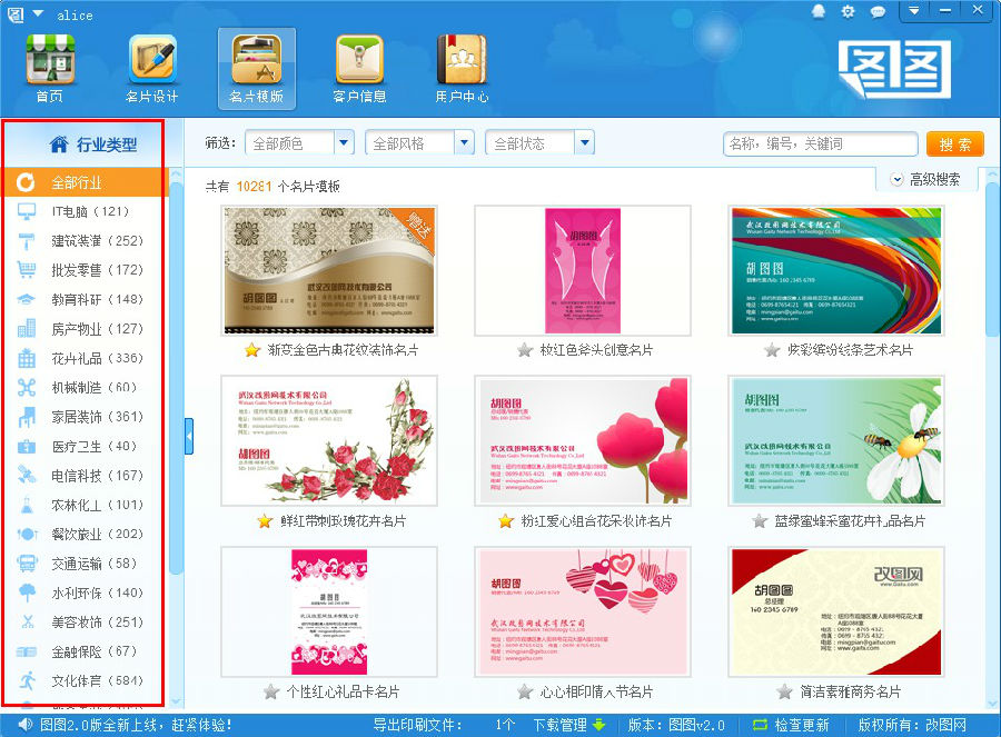 登录图图,在“名片模板”中选择适合您的模板。可通过颜色及行业分类快速筛选及查找。