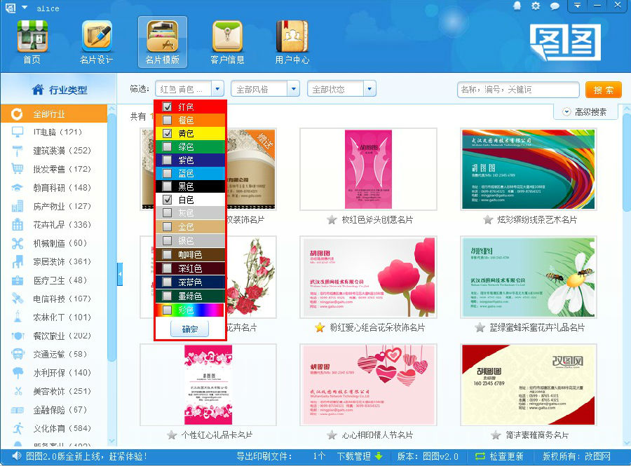 在通过颜色分类查找模板的方式的基础上,图图2.0升级版支持颜色多选,如图,选择一种或多种颜色后,点击“确定”,系统将自动筛选出相应颜色的模板。