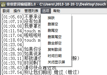 选项菜单,换肤、删首空、删尾空、删首尾空、删全部空、复制歌词、时间日期、关闭显示屏