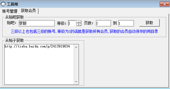 1、在获取会员是,从贴吧获取,等级选择三级以上包括三级的帐号,等级为1的话就是获取所有会员,获取的会员自动保存的同目录。