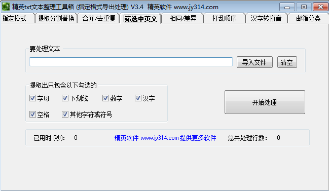 精英txt文本整理工具箱是个多功能的综合文本管理工具,提供了多个文本操作的功能,分割提取替换,合并去重复,筛选中英文,打乱文本顺序,汉字转拼音,邮箱分类等等,可以将各类常用的数据保存到文本里面,使用这款文本整理工具箱进行不同需求的操作,方便实用,能够大大提高你的整理效率。