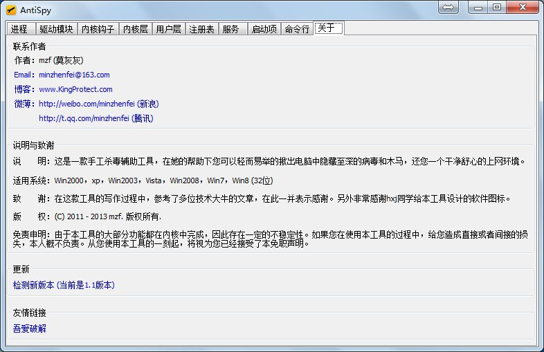 平时还可以简单的将其当做增强版任务管理器使用,查看进程、结束进程、删除驱动文件、停止服务、解锁注册表、管理器启动项等等都可以轻而易举的实现,此工具支持WinXP、2003/2008、Win7(32位)、Win8(32位)操作系统,界面语言支持简体中文和英文,随着操作系统的语言而自适应。