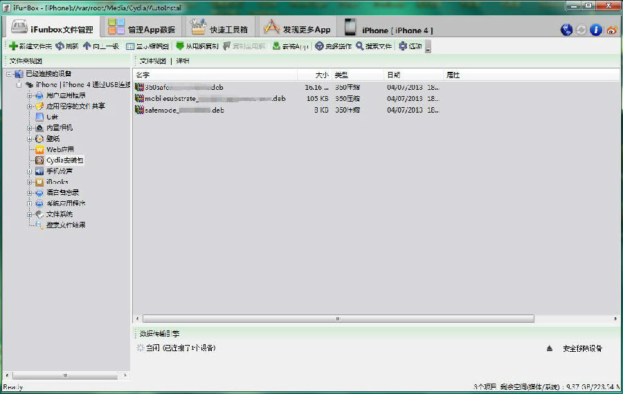 将安装包复制到ifunbox里的Cydia App Install文件夹里(若无该文件夹,请安装插件afc2add),然后重新启动手机,开机后不进行任何操作等待3-4分钟,即可自动完成安装。