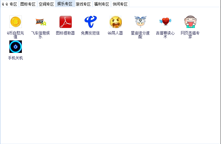 娱乐专区:Q币充值自慰器、飞车信息娱乐、图标提取器、QQ骂人器、星座缘分速配、吉普赛读心术、网页恶搞专家、手机关机