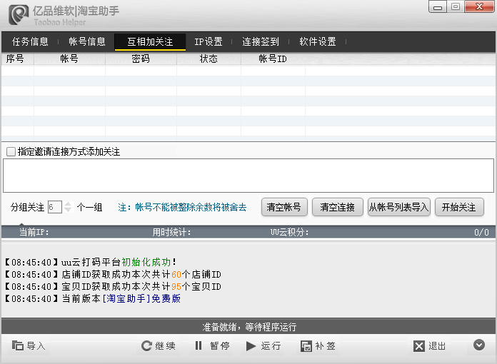 添加帐号:请点击帐号导入或直接将帐号文本文档拖入帐号信息框内