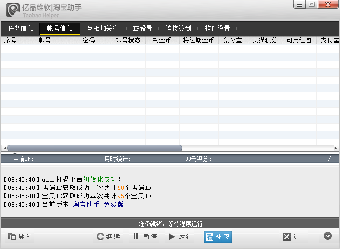 多帐号淘宝助手是一款多功能全自动帮助淘宝用户完成各种淘宝任务的一款辅助工具,可以每日自动一键完成淘金币任务、集分宝任务、淘宝抽奖等等,支持多帐号操作,适合那些拥有大量淘宝帐号的用户使用,工具功能齐全,十分智能,是淘宝达人必备工具!