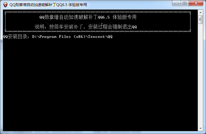 第二款软件,直接双击运行,会自动检测QQ安装目录,按回车安装补丁,安装过程会强制退出QQ。成功之后重启QQ即可!