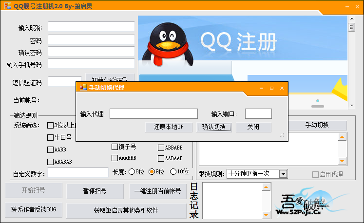 下图为箫启灵qq靓号注册机2.0新版功能:日志记录、代理换IP、自定义数字