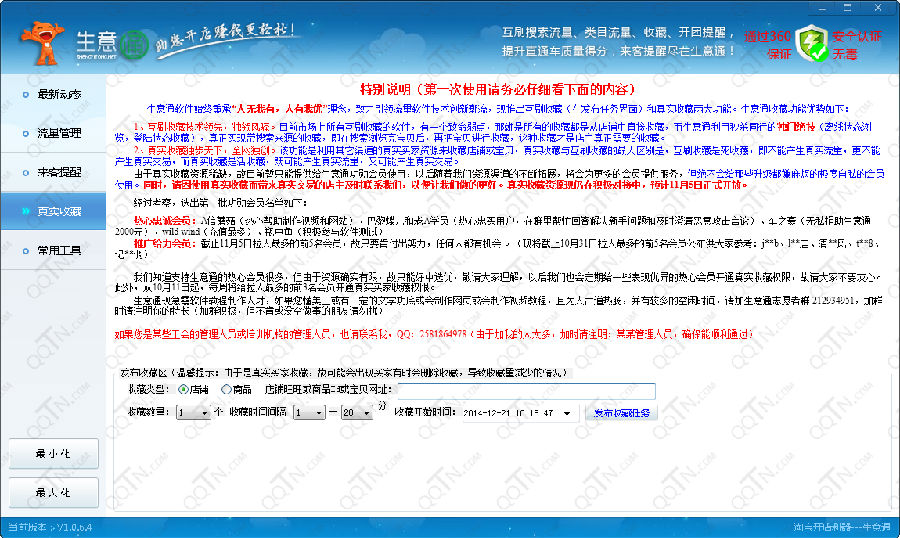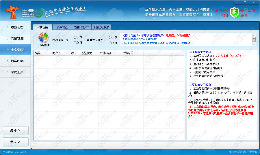 淘宝生意通是淘宝卖家开店必备软件,帮助您轻松开店赚钱。软件提供宝贝刷流量、刷收藏、来客提醒、宝贝排名上下架时间查询。以最快的方式提升宝贝排名,增加浏览访问量,最大化提高宝贝成交率。有淘宝生意通在手,淘宝开店,轻松无忧!