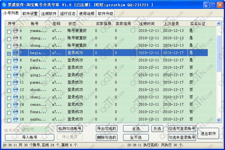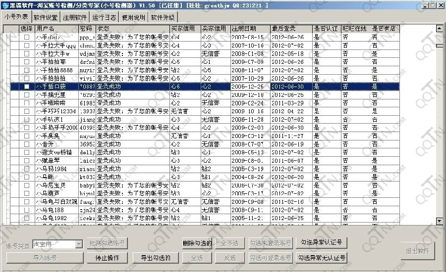 1、超高速批量检测您小号的状态/信用/注册时间/最后登录时间/是否经实名认证