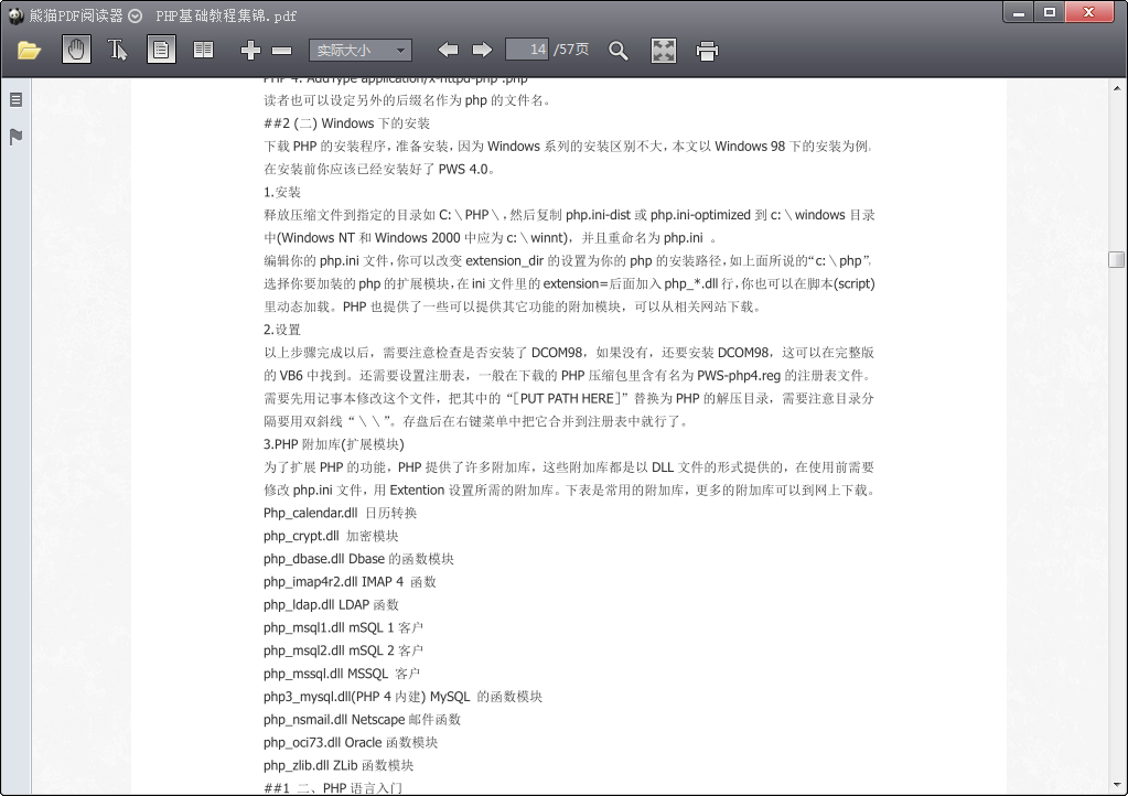 支持目录、书签、放大缩小、复制选定内容及图片、打印等功能;记住、清除阅读历史记录;以及支持单、双页阅读模式 。