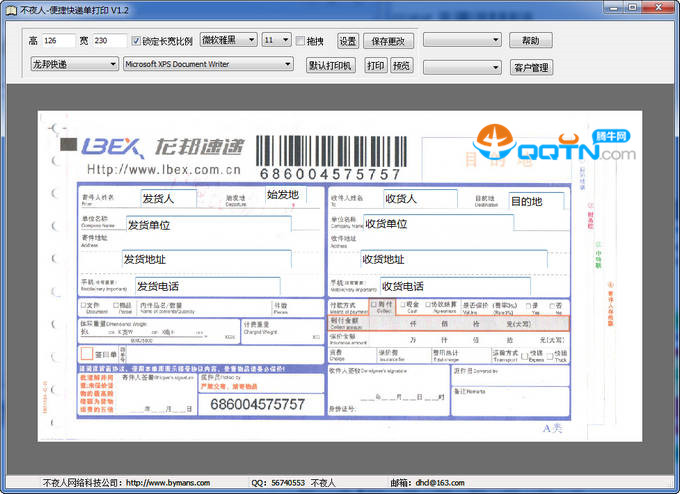 特别说明一下,本软件是套打软件,在不同打印机、不同电脑上、甚至同一电脑上使用不同分辨率,其标签位置显示是不一样的,这就需要针对不同情况,具体情况反复调整标签位置,以达到准确定位之目的。