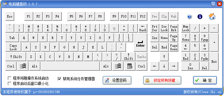 2、本程序对电脑键盘上的“Power”、“Sleep”、“WakeUp”等按键的锁定可能无效。如果要锁定或解锁包括以上按键的整个键盘,可按下键盘上的“KeyLock”键或同时按下“Turbo”键和“F11”键(在用户的键盘上有“KeyLock”键或“Turbo”键的情况下)。