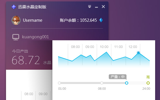 迅雷水晶定制版是迅雷水晶挖矿的监视工具,拥有生产总览、矿机监控、离线预警、趋势对比等功能,帮助用户贡献闲置宽带!