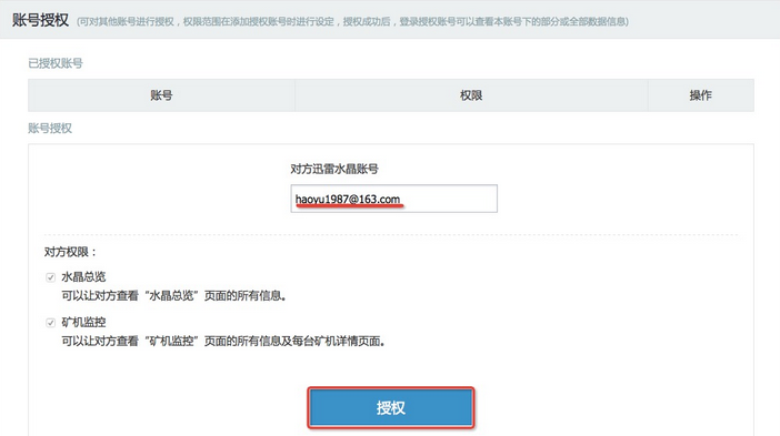 进入“个人中心”,“账号授权”功能区域,在“对方迅雷水晶账号”输入框输入迅雷水晶账号,并点击【授权】;