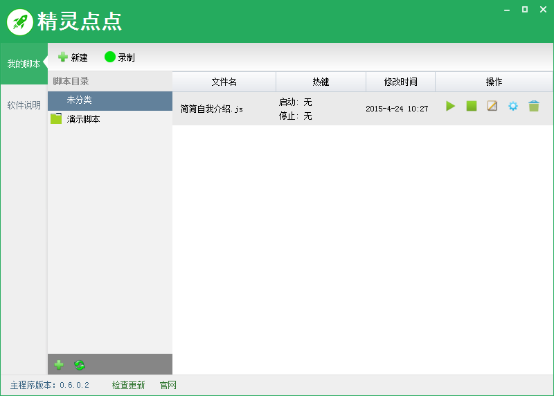 每一项代表一个脚本,其中最后一栏为操作栏,操作栏总共有五个按钮,分别对应五项操作。