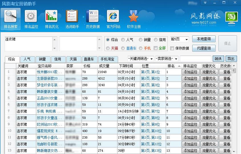 风影淘宝营销助手是一款由风影软件工作室制作的多功能淘宝助手工具,这款软件集淘宝宝贝关键词排名查询、排名监控及淘宝排名优化功能于一体,具有淘宝商品搜索综合排名、人气排名、销量排名、信用排名、天猫排名、直通车排名、手机淘宝排名批量查询与排名实时监控以及淘宝商品搜索排名流量优化等功能。是国内专业的淘宝排名查询软件、淘宝排名监控软件和淘宝排名优化软件。