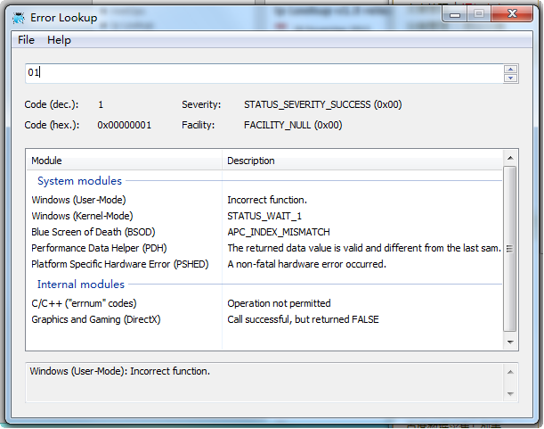 错误信息查看工具 Error Lookup 是一款编程辅助小工具,程序用于接收有关 Windows 错误的信息,输入错误代码并获得错误描述。可以使用 Windows 代码,DirectX,NTSTATUS (本机 API),WinInet,设备管理器,停止 (蓝屏)帮助程序库的错误代码。