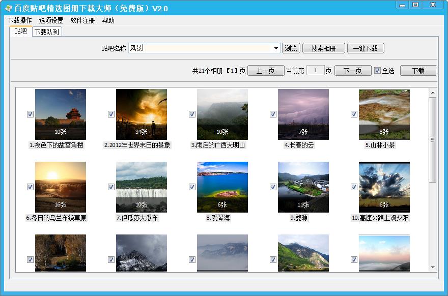 1、启动软件,输入贴吧名称,后点击“搜索相册”按钮,即开始搜索该贴吧下的图册,搜索到的图片以分页方式显示,每页显示30条记录。