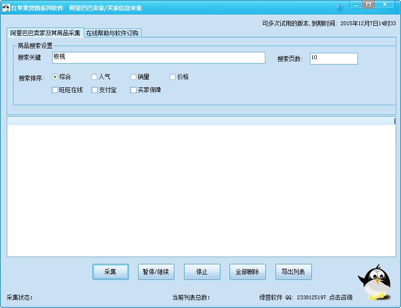 红苹果阿里巴巴卖家/买家信息采集是一款阿里巴巴数据采集器,可以批量采集阿里巴巴买家和卖家的信息,并且可以按照关键词,昵称,旺旺等采集,采集的买家信息超过10项,同时支持数据去重复,实时导出,是网络营销必备的推广工具,欢迎下载使用!