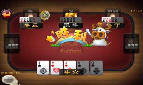 游戏可以由2人到6人同时进行,总共52张牌(除大小王),在确定庄家后,系统将给予玩家每人5张牌,用户将根据5张牌进行排列组合,并且闲家一一和庄家进行大小比较确定胜负。玩家必须将手中的5张牌分为两组,第一组牌数为3张,第二组为2张。如果这里出现的两组牌中,点数成为10的倍数的话,就是获得胜利的。
