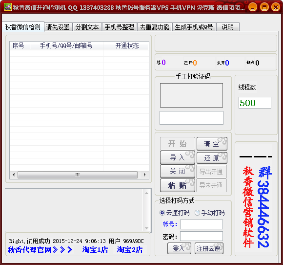 这款秋香微信开通检测机不注册,也可享受免费30分钟的试用期限,打开软件后选择“试用开启”即可,能够帮助用户批量查询各类手机号、QQ号、邮箱号是否开通微信。