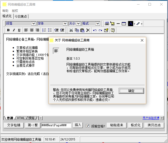 网络编辑超级工具箱版权所有者为网络编辑之家,任何单位和个人无权修改版权和软件功能,违者必究。
