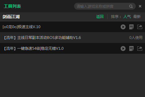 新浪剑雨江湖辅助目前共提供了极速主线、主线日常副本活动BOS多功能辅助以及一键急速54级三款游戏脚本,玩家尽管免费使用,还支持游戏微端哦!
