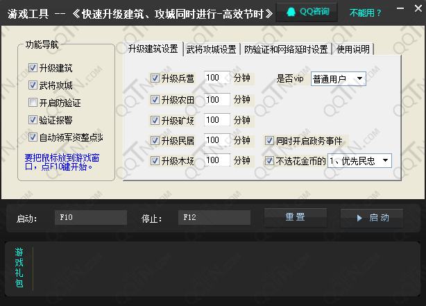 本辅助主要用于三国乱世游戏中快速升级建筑使用,并且升级武将攻城同时进行,高效率节省大量时间。本辅助支持普通用户和VIP用户使用。还有防验证功能,让你可以长时间安全放心挂机。
