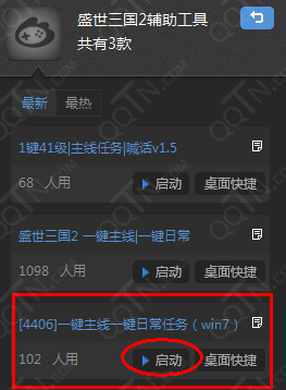 4.在盛世三国2辅助工具中“启动”“盛世三国2[4406]一键主线一键日常任务(win7)”
