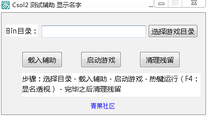 使用CSOL2显名辅助首先选择目录,然后点击“载入辅助”按钮, 再点击“启动游戏”,在游戏中按热键运行(F4:显名透视),完毕之后需清理残留。