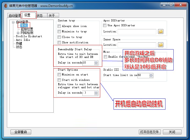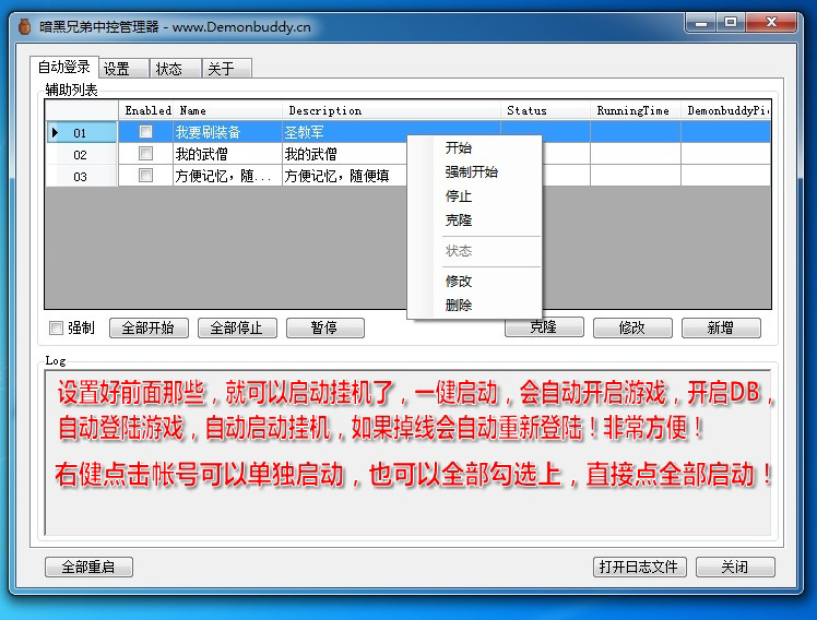 "暗黑兄弟中控管理器”智能管理暗黑3游戏和Demonbuddy软件,一健启动,自动登陆,自动开启DB辅助,然后自动运行挂机!