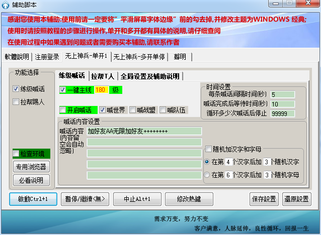 无上神兵辅助脚本主要提供练级喊话和拉帮T人,其中练级可一键主线180级,喊话支持世界、战盟以及队伍。