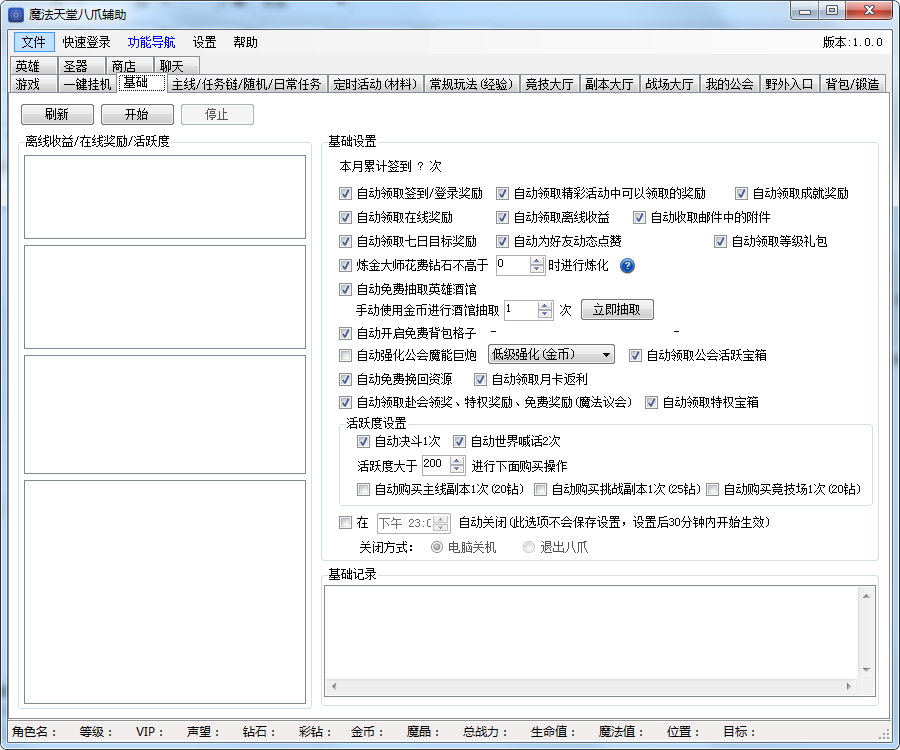 魔法天堂八爪辅助是一款专为网游《魔法天堂》制作的多功能辅助工具,魔法天堂八爪辅助支持游族、360、37玩,迅雷等等平台,每天自动副本,自动竞技场,自动主线任务,自动世界BOSS,定时活动等等,为用户节省大量时间,工作游戏两不误!喜欢玩魔法天堂的朋友可以来试试这款八爪辅助。