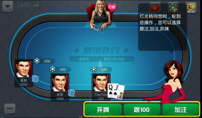 灯光转向您时,轮到您操作,您可以选择跟注、加注、弃牌