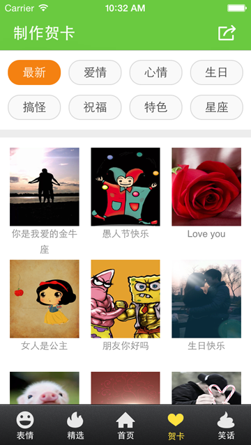 节日到来,常常不知道如何送出祝福,腾牛微助手贺卡栏目为您制作了最新流行的贺卡模版,涵盖了爱情、心情、生日、搞怪、祝福、特色、星座七大题材,提供数百款个性化免费主题模版,搭配精心设计的背景音乐打造专属于自己的“私人定制”贺卡哦!