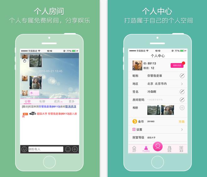 人人免费创建个人房间,分享上传语音、视频、照片等生活娱乐信息,建立自己的粉丝群体,同小伙们互动娱乐